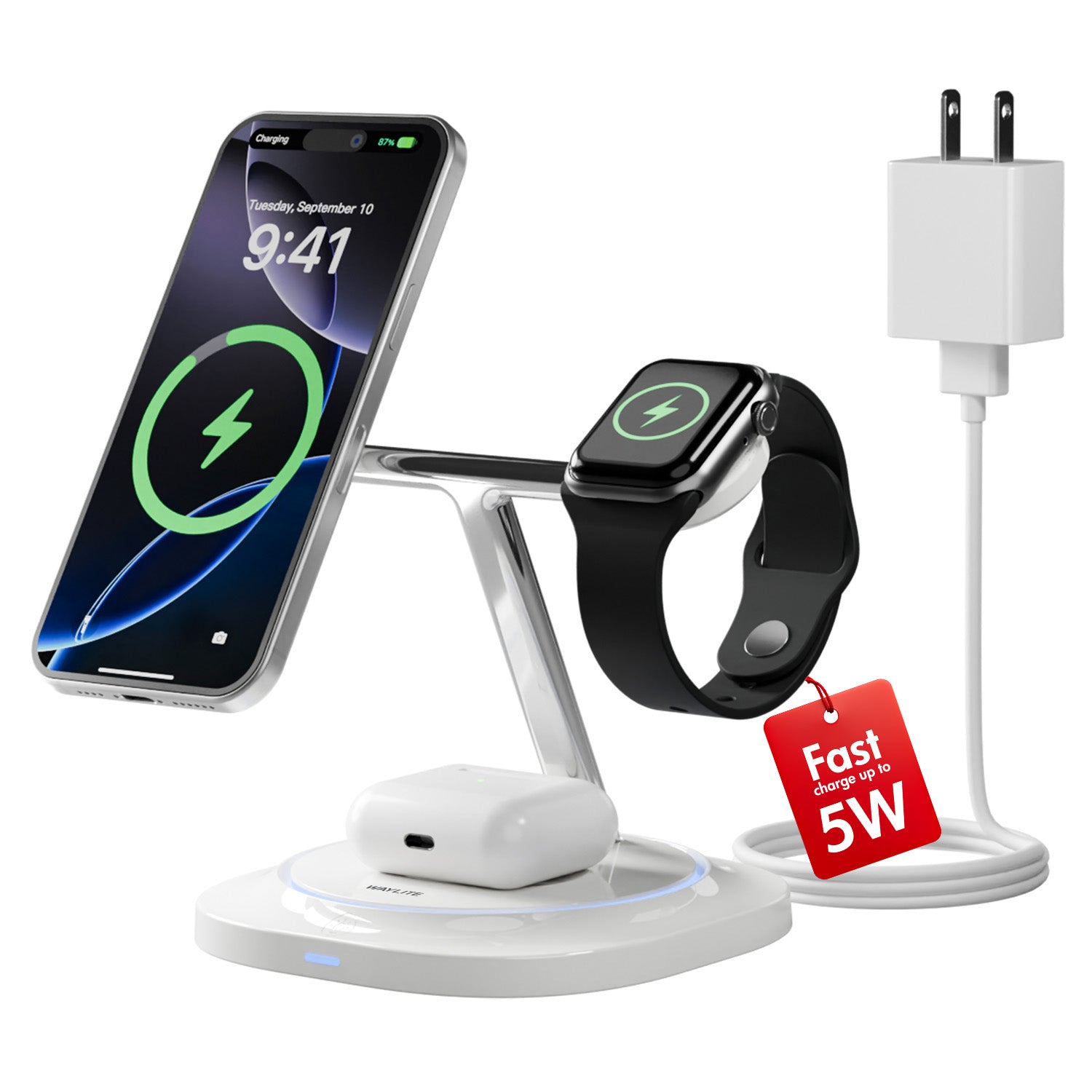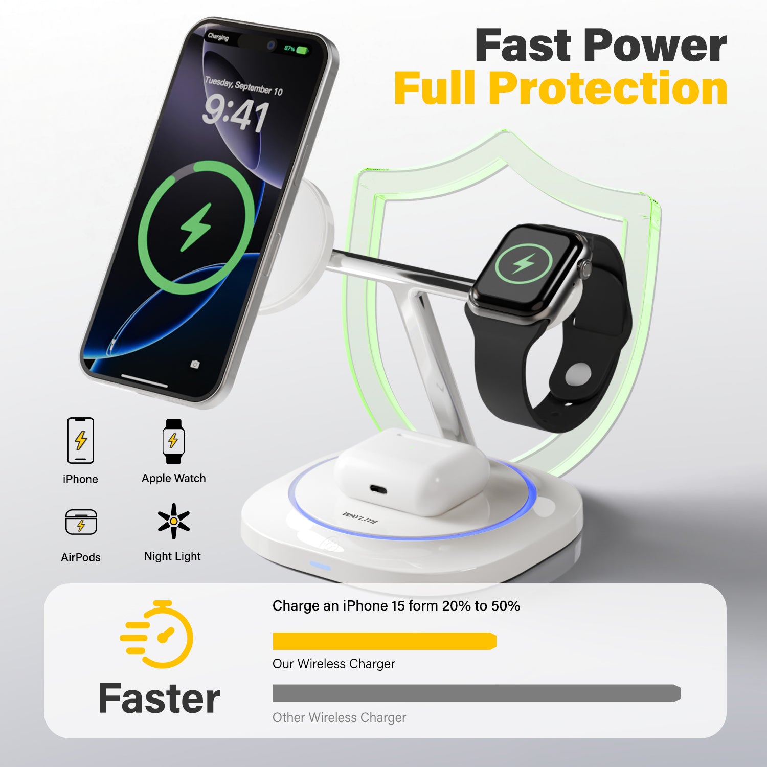 - All-in-One Charging Solution: Power your iPhone, Apple Watch, AirPods, and enjoy a soft night light. Plus, two power options are available. The high-power 15W 3-in-1 magnetic charger delivers faster charging speeds.