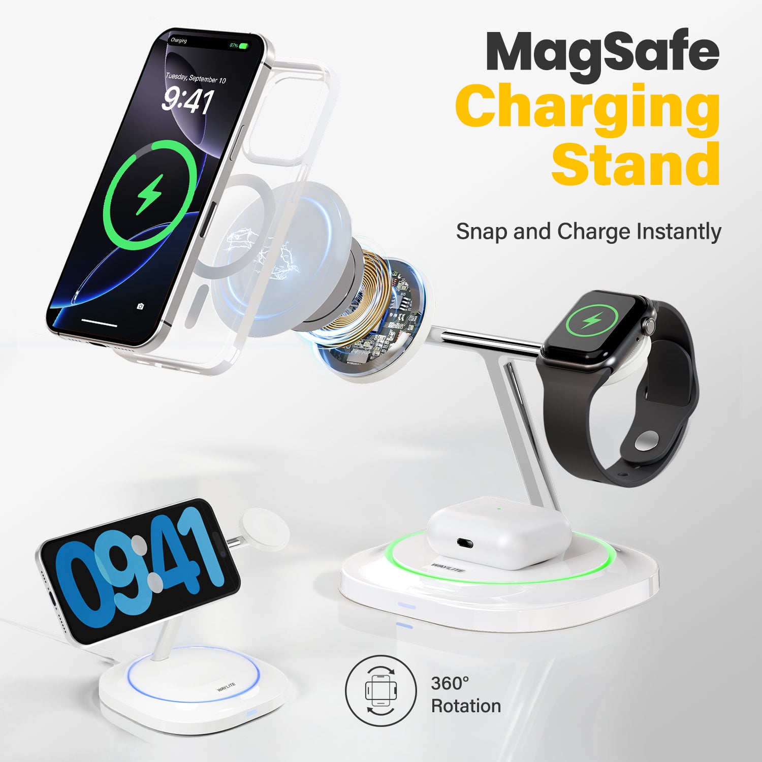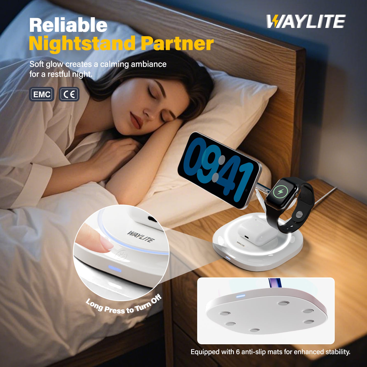 - Nightstand Charger: Wake up to fully powered devices with the quiet, reliable Waylite 3-in-1 magnetic wireless charger