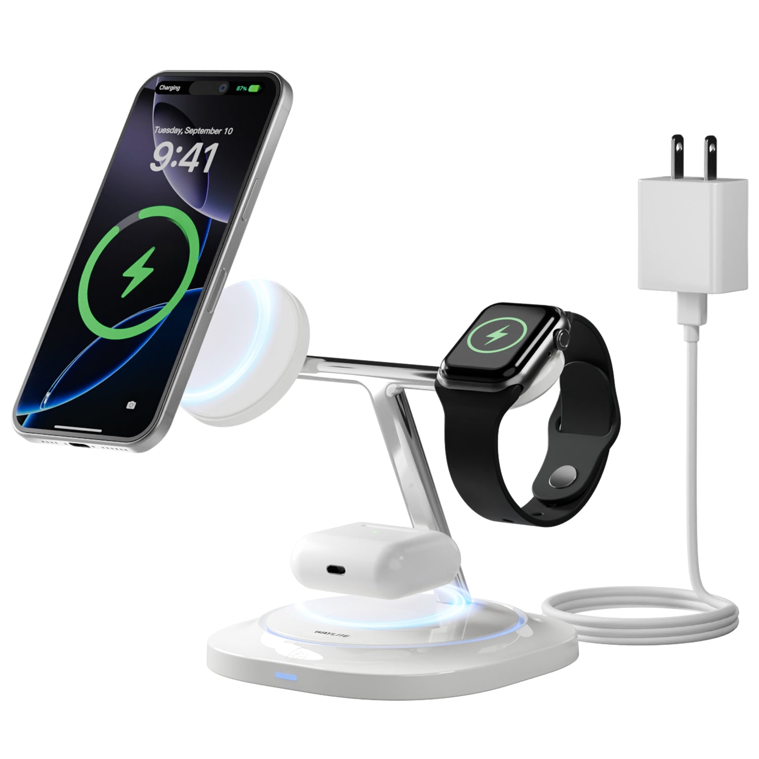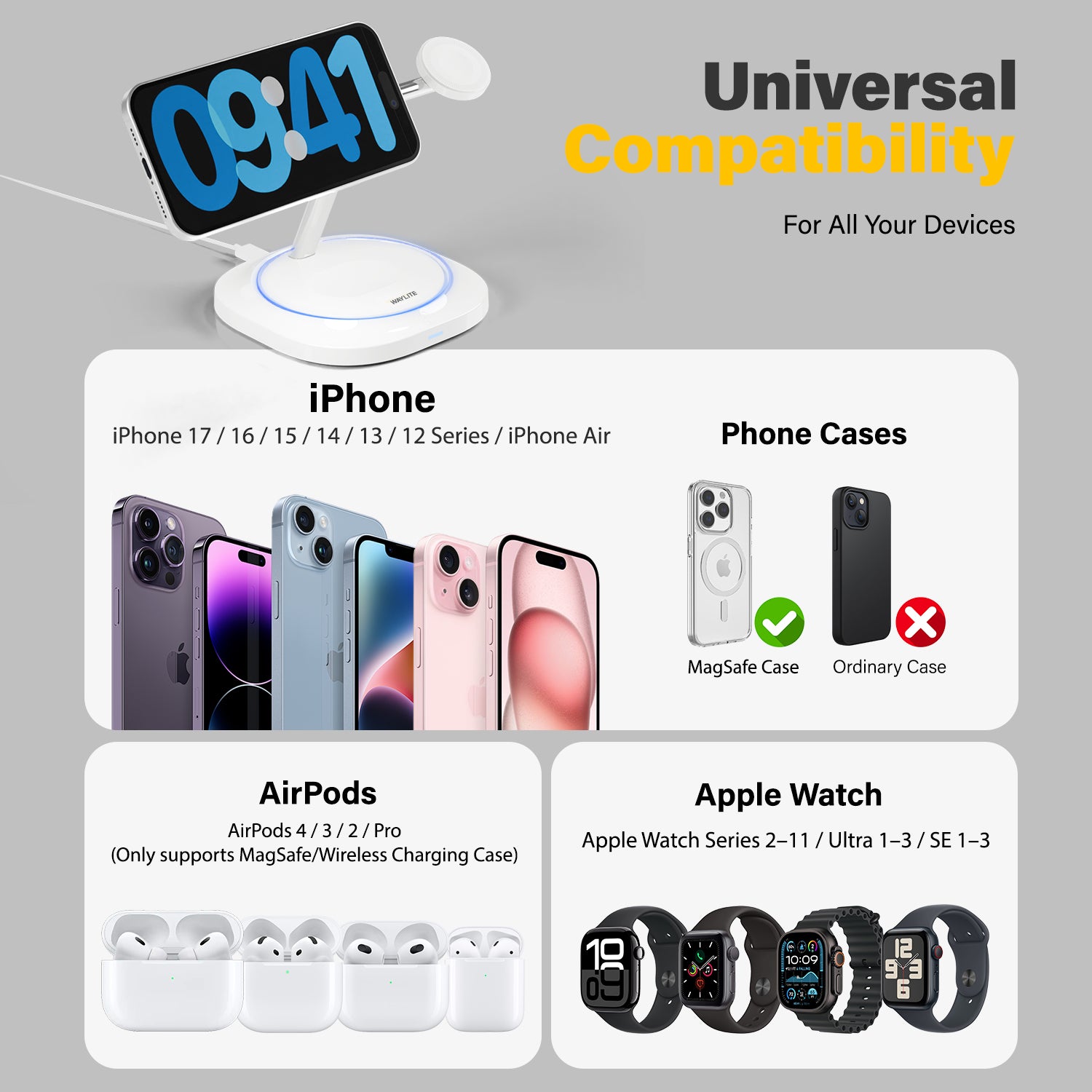 - Universal Compatibility: WayLite 3 in 1 wireless charging station is perfectly compatible with iPhone 17/17 Pro/17 Pro Max/iPhone 16/16 Plus/16Pro/16 Pro max/15/15 Plus/15Pro/15 Pro max/14/14 Plus/14Pro/14 Pro max/13/13Pro/13Pro Max/13 mini/12/12Pro/12Pro Max/iPhone 12 mini & Apple iWatch 10/9/8/7/6/5/4/3/2/SE/Ultra 1/2 & AirPods Pro2/Pro/4/3/2(Note: for Airpods 2 3 4, needs work with a MagSafe charging case)